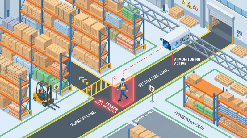 Hệ thống sử dụng công nghệ Edge AI để phân tích dữ liệu hình ảnh trực tiếp tại thiết bị, giúp phát hiện hành vi nguy hiểm với độ trễ thấp. Tại các khu vực giao cắt hoặc khu vực có xe nâng hoạt động, doanh nghiệp có thể thiết lập các vùng giám sát để kiểm soát hành vi di chuyển của người lao động.